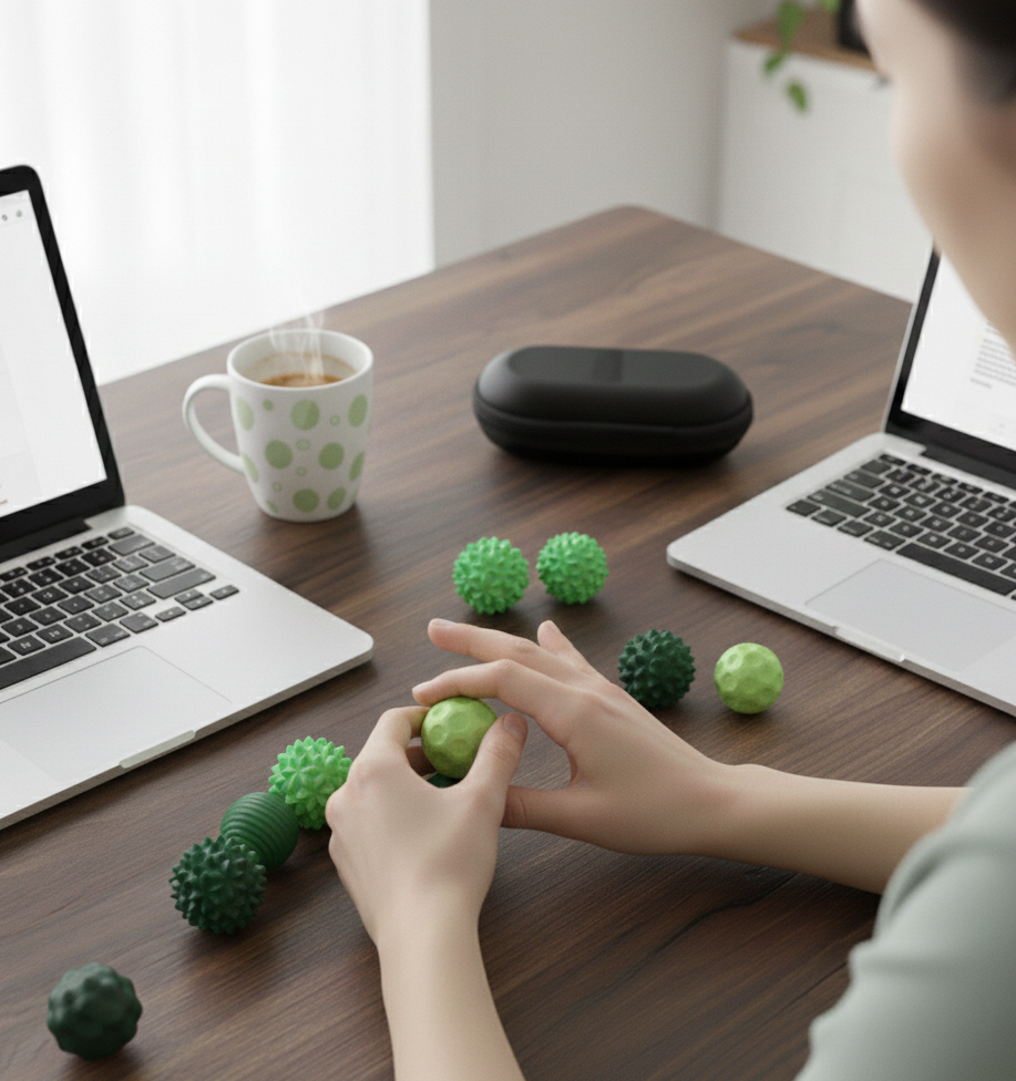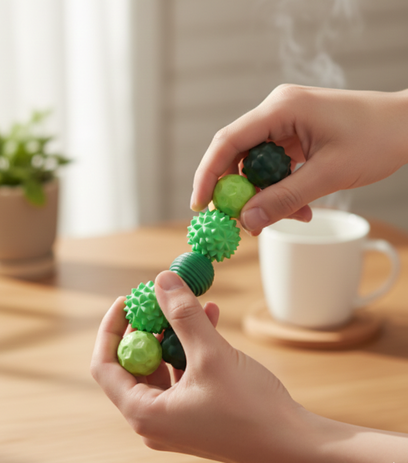 - ULGA DLA DŁONI I NADGARSTKÓW – Różnorodne struktury kuleczek masują receptory i poprawiają krążenie, przynosząc ulgę po całym dniu pisania na klawiaturze czy scrollowania telefonu.