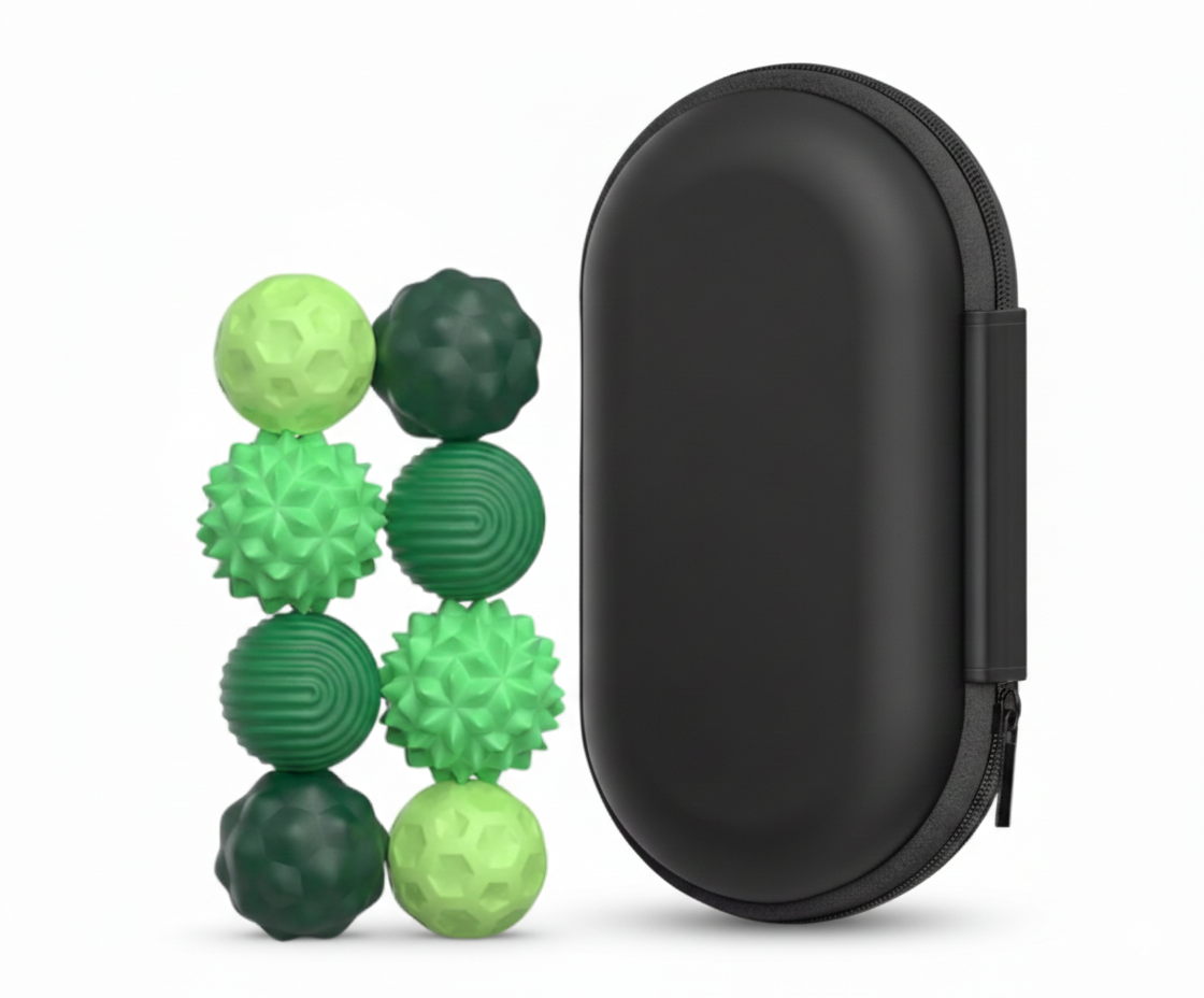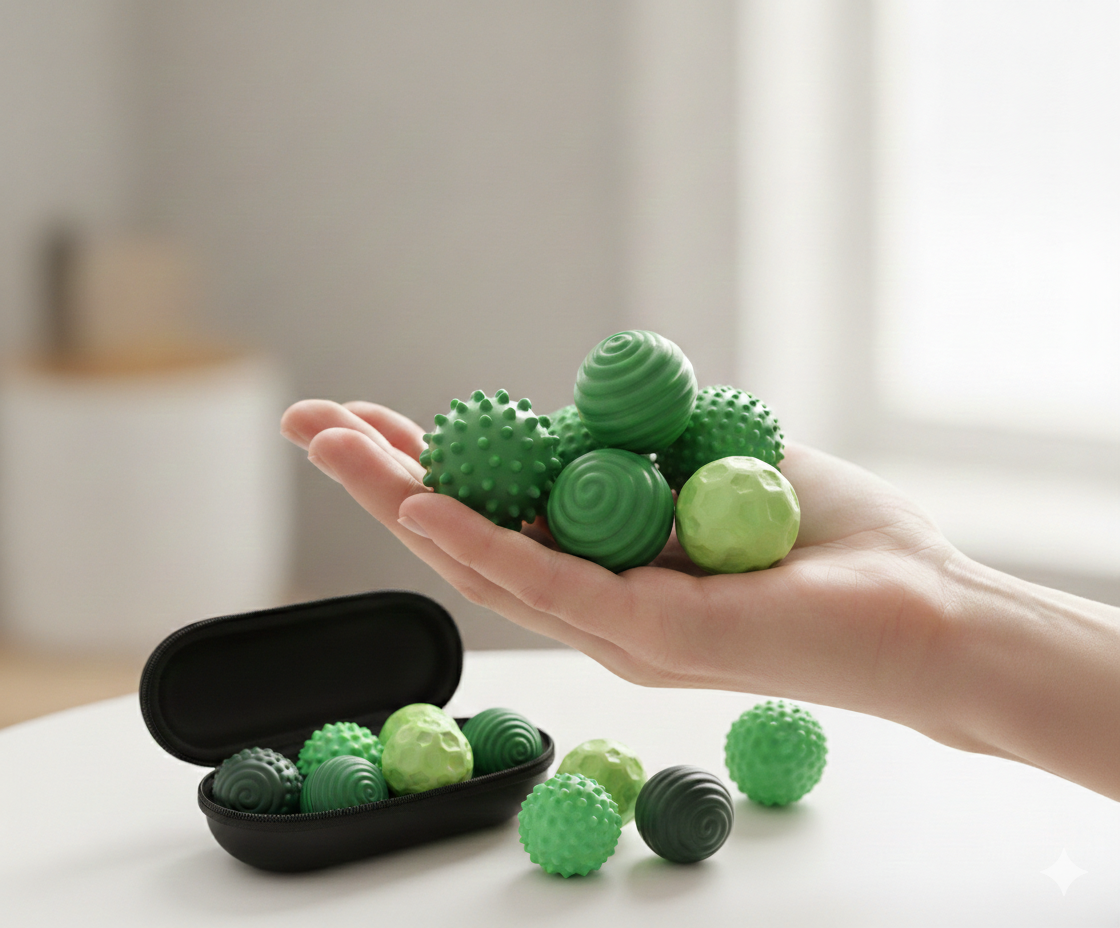 SENSORYCZNA RÓŻNORODNOŚĆ – Każda kuleczka ma inną twardość i fakturę, od delikatnych fal po stymulujące kolce. Dzięki temu możesz dopasować bodźce do swojego aktualnego nastroju i poziomu stresu, dostarczając mózgowi dokładnie tego, czego potrzebuje.
